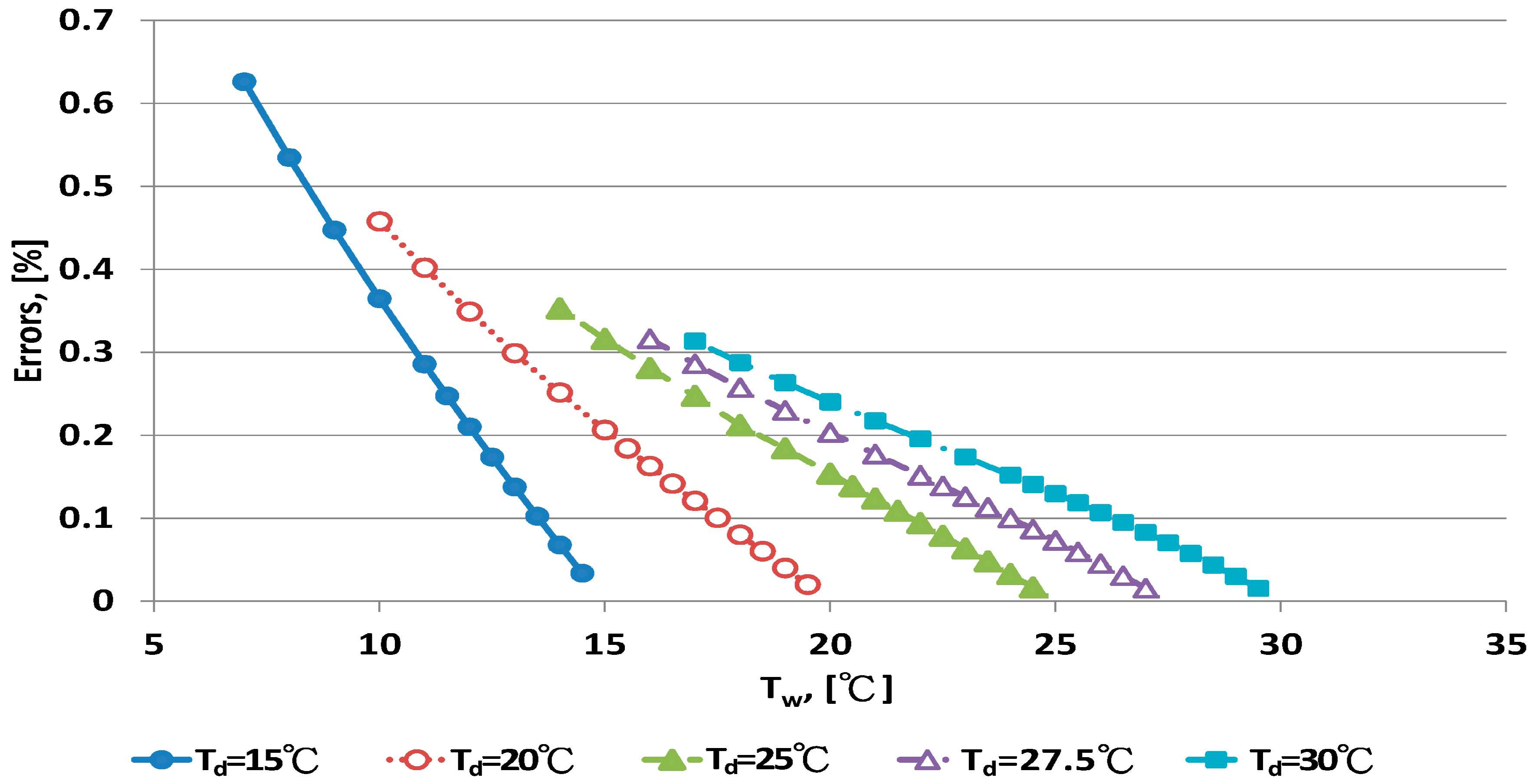 The error sources of the Tw measurement include the thermometer performance and the velocity of the air passing the wet bulb thermometer. The combined errors in this study ranged from 0.15 °C to 0.9 °C. If other factors were involved, the errors of Tw measurement may range from 0.2 °C to 1.0 °C. According to the study of Barber and Gu [31] ±0.5 °C was a common error for an aspirated psychrometer.