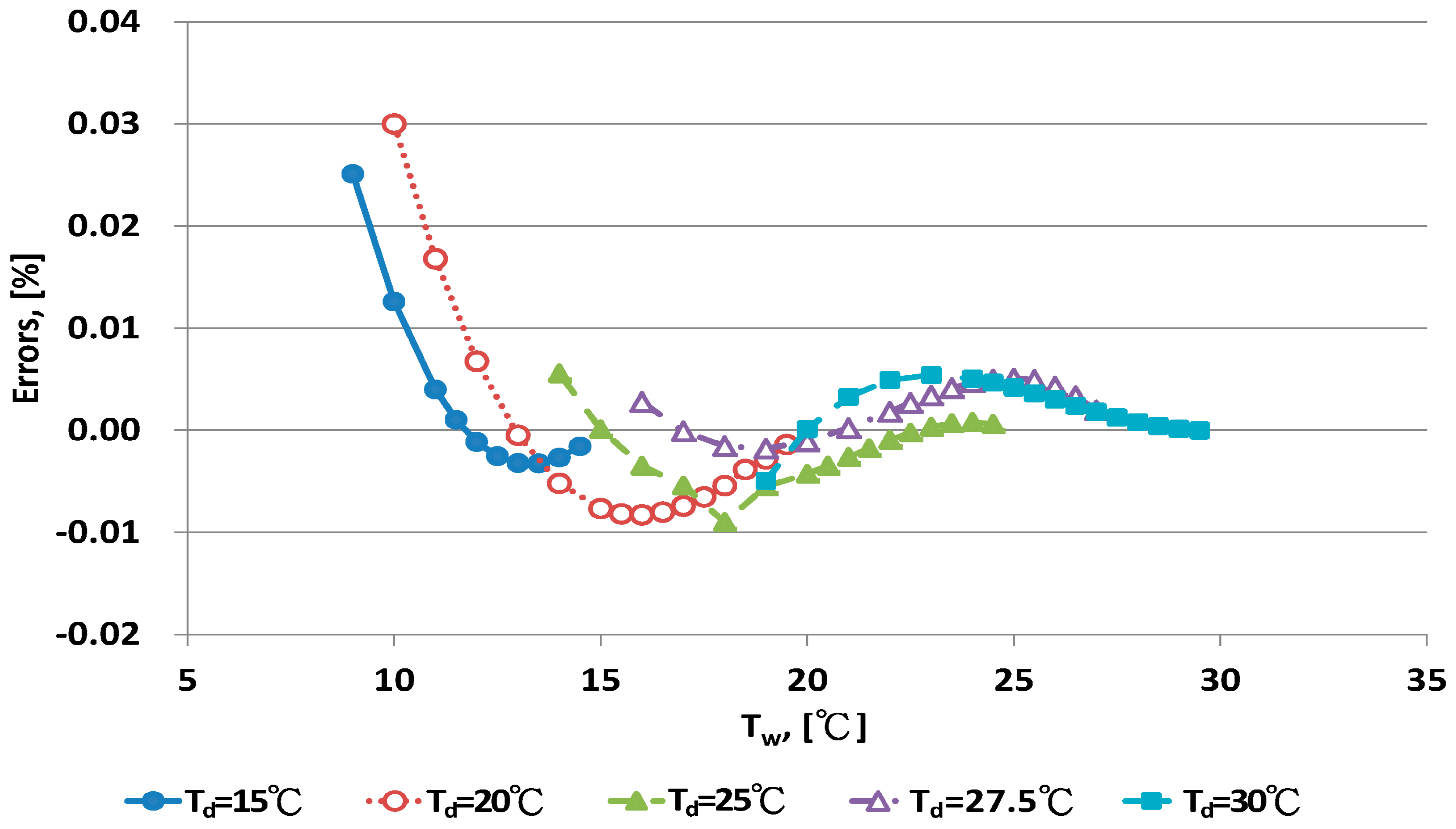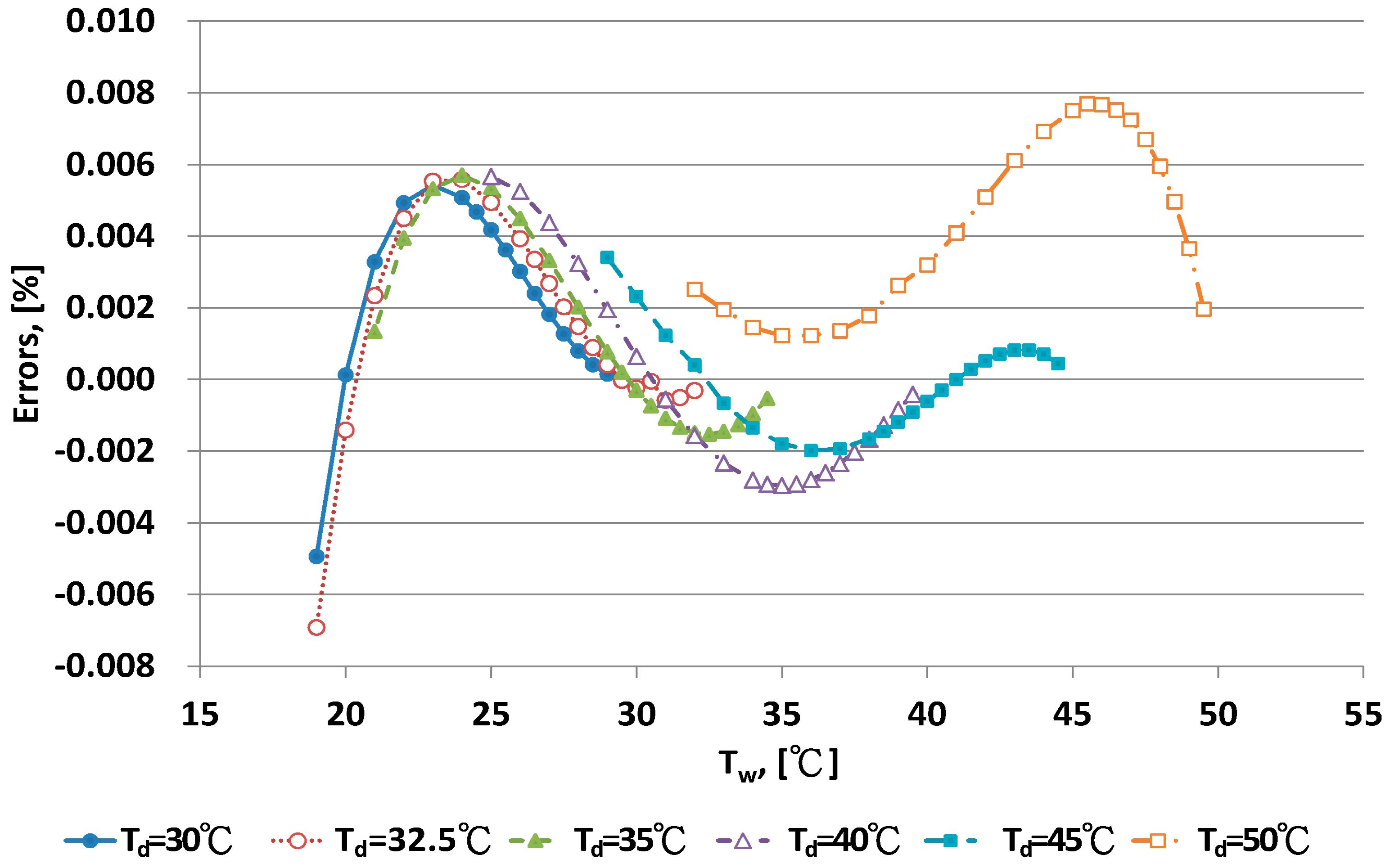The error distribution for the new As equation for different dry bulb temperatures is shown in Figure 9 and Figure 10. With Td < 25 °C, larger errors were found at the lower range of Tw. With Td > 30 °C, error distributions were curved. With a more complex form of the As model, for example, when higher order polynomial equations were used, the error distribution of the curve shapes could be improved. However, the new As equation, Equation (10), could be easily computed with a calculator. The predictive value of errors was <0.1% RH. This error could be acceptable in term of practical application for humidity measurement [1,8], so Equation (10) is recommended as the adequate As equation.