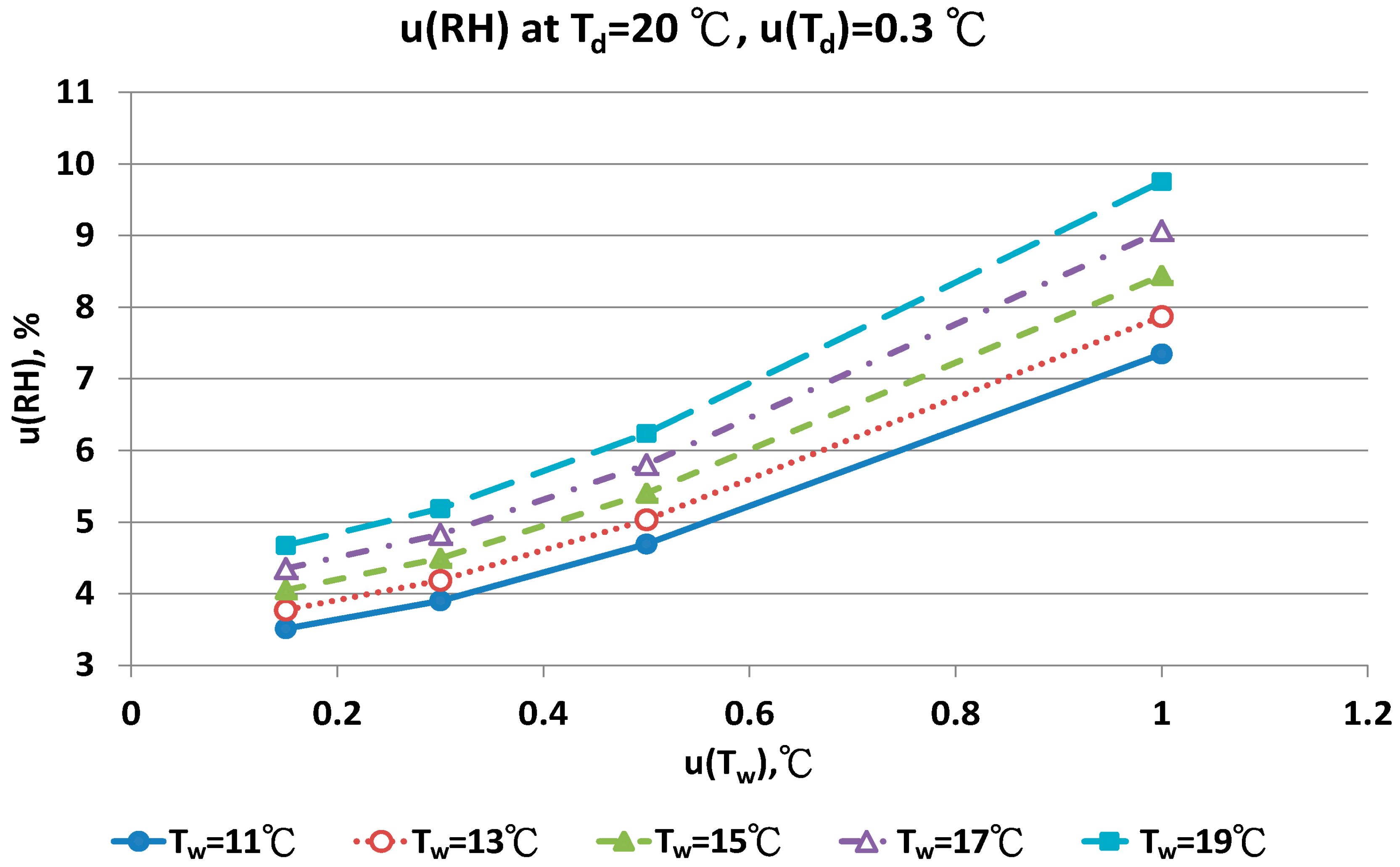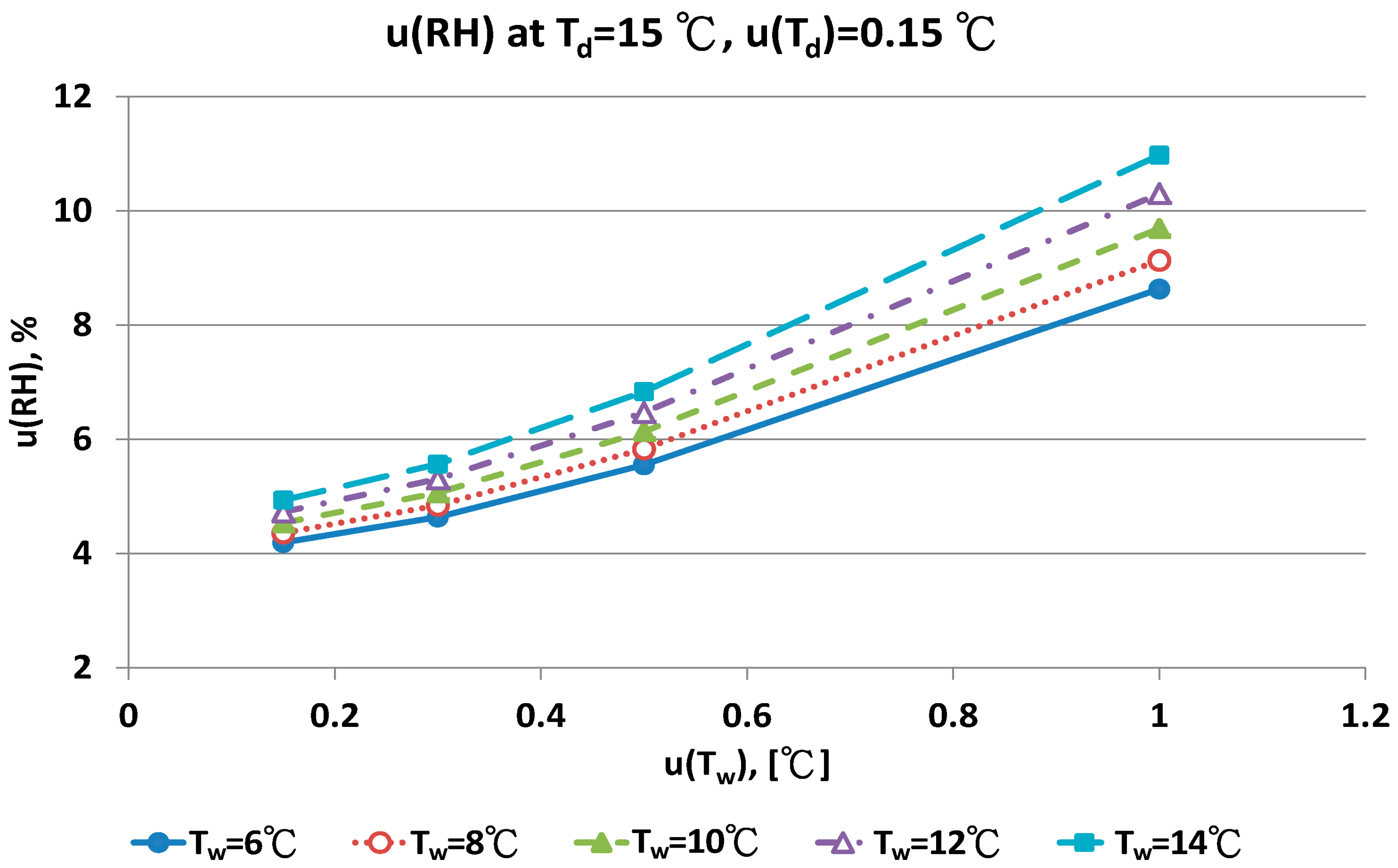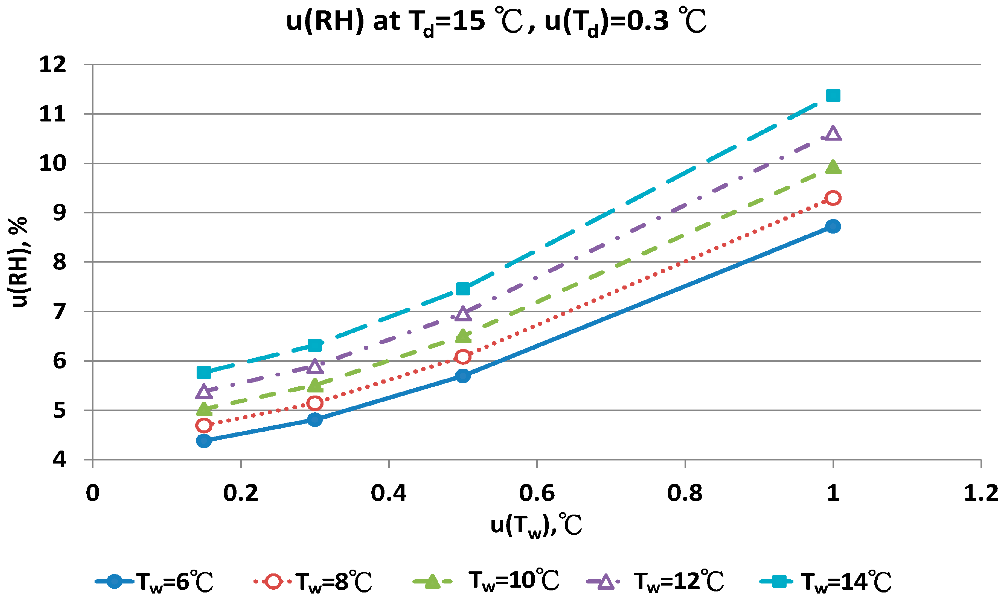 Figure 11 show that with increased uncertainty of the wet bulb thermometer, u(Tw) enhanced the combined uncertainties of u(RH). At the same u(Tw), higher wet bulb temperature induced larger u(RH) value.