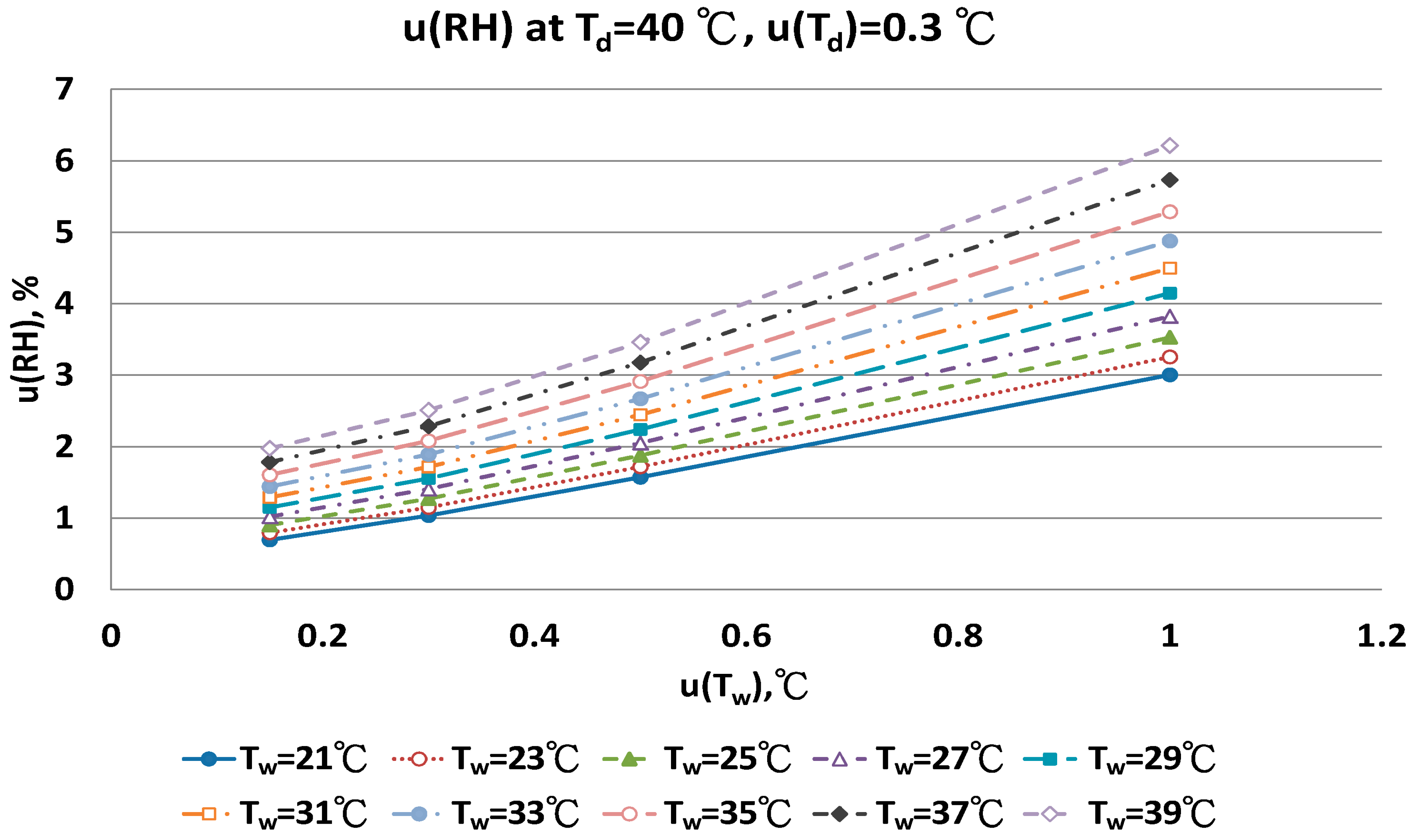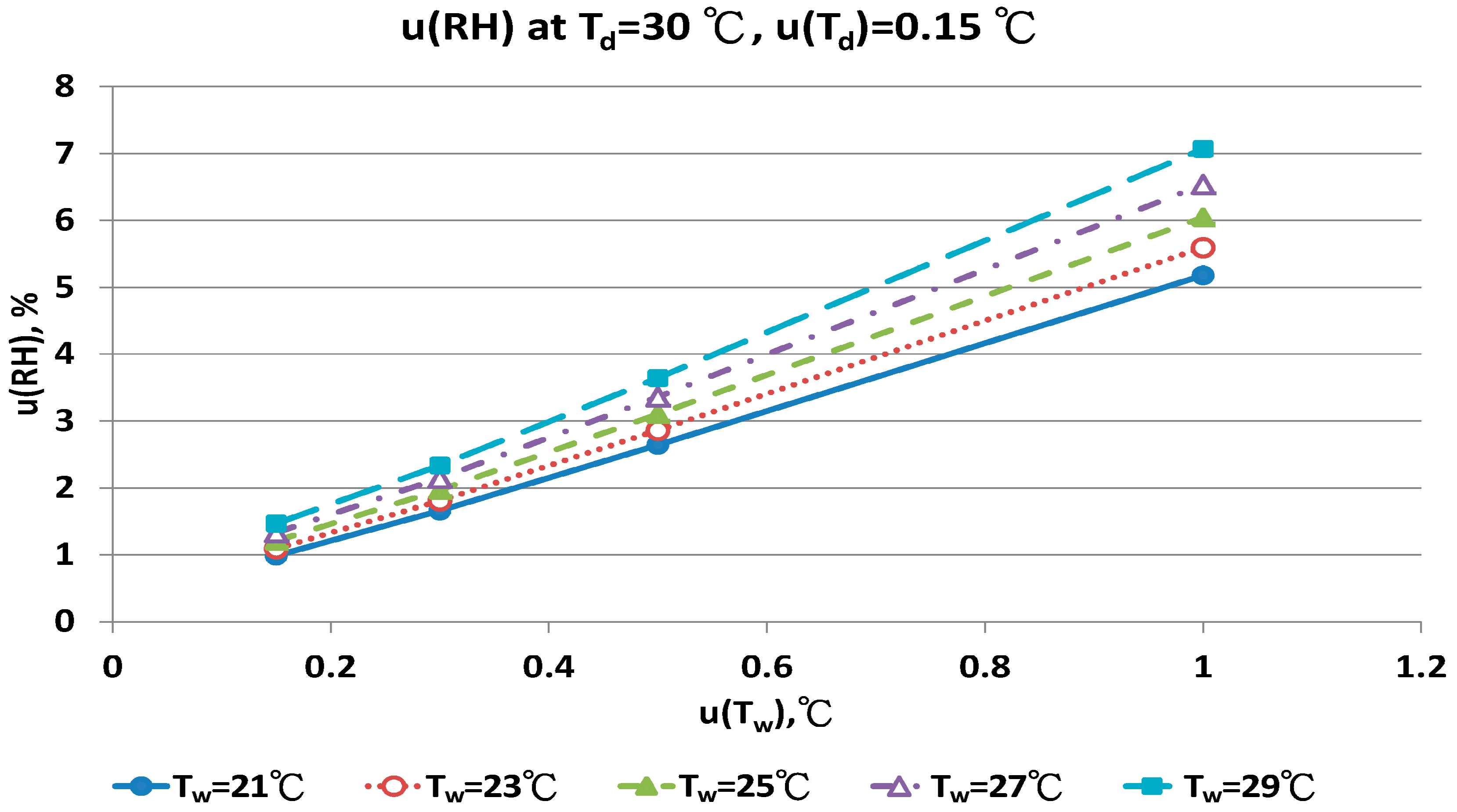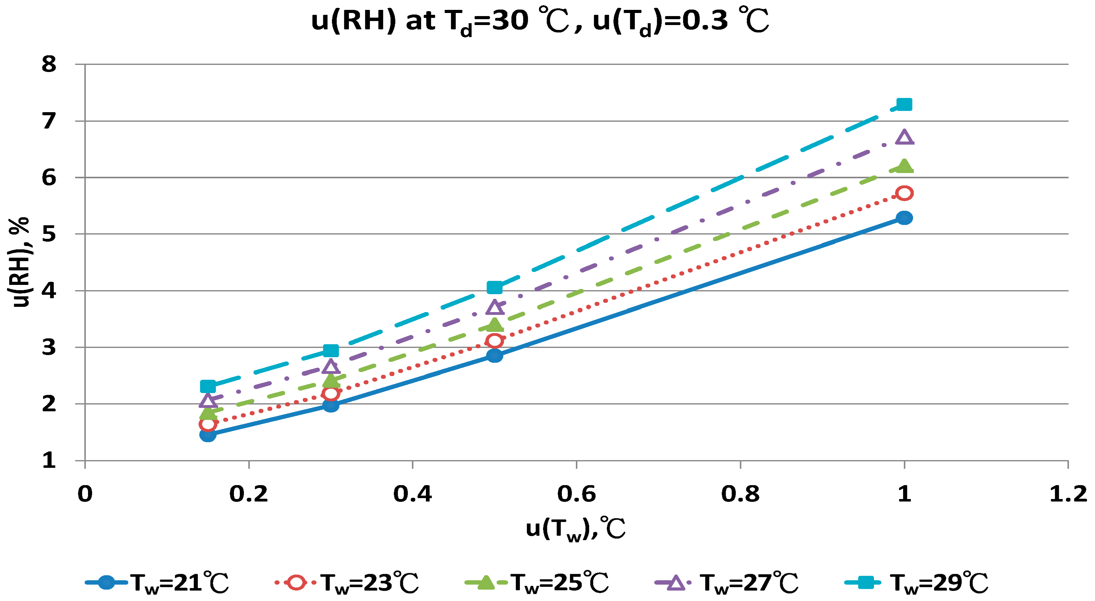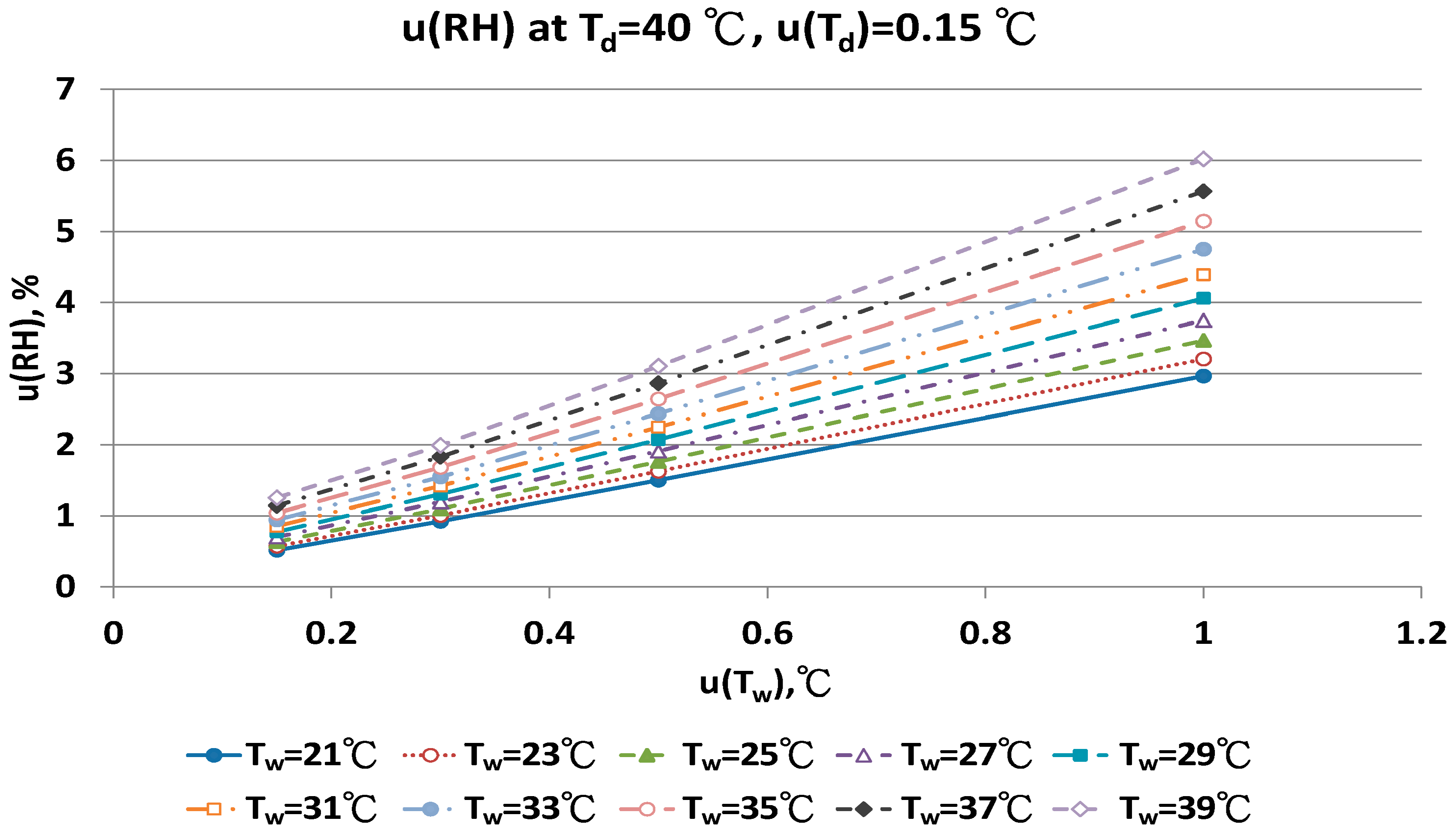 Figure 11 show that with increased uncertainty of the wet bulb thermometer, u(Tw) enhanced the combined uncertainties of u(RH). At the same u(Tw), higher wet bulb temperature induced larger u(RH) value.