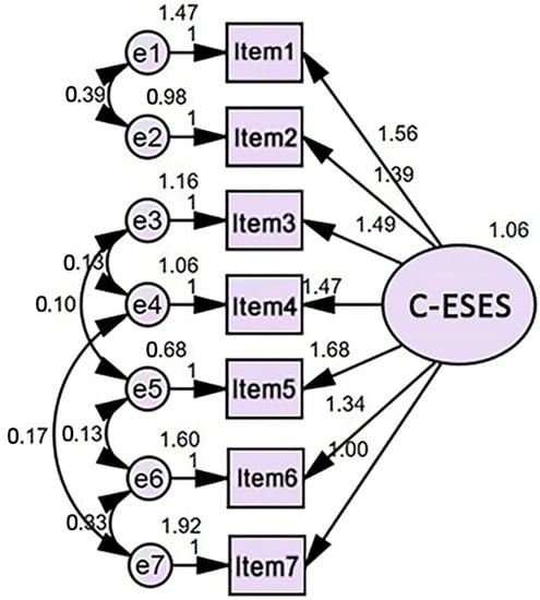 A structural model for parameter estimation was generated using AMOS. Under the 95% confidence interval, with the number of bootstrap samples being 5000 [], four indices showed that emotional self-efficacy had a high baseline fit within a reasonable approximation error: goodness of fit index (GFI) = 0.992, comparative fit index (CFI) = 0.998, root mean square error of approximation (RMSEA) = 0.032, and Akaike information criterion (AIC) = 51.706. Figure 1 depicts the revised statistical model for the emotional self-efficacy of Chinese respondents (C-ESES). It was based on the relationships among one latent variable (oval), seven measured items (rectangles), and seven corresponding unobservable errors (circles).