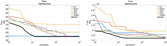 Table 3 demonstrates the statistical results of optimization in the case study. As can be seen, the FHO algorithm could dominate most of the alternative metaheuristic algorithms in the first scenario of time optimization in the case study, which calculates 258 days as the best and optimum time, similar to the MVO and SOS algorithms. Regarding standard deviation (Std), the FA algorithm delivers the most minimal result, followed by the FHO algorithm, accounting for 0.18. In comparison, the PSO algorithm provides the most significant value of Std, registered at about 35.07. Moreover, the SOS algorithm could conduct the time optimization process in the smallest feasible time (1.40 s); on the other hand, the longest computing time is acquired by the FHO and PSO algorithms, needing significantly more time to conduct the optimization process in this case. Evident is the fact that the FHO algorithm outperforms other alternative metaheuristic algorithms in the case study’s second scenario (cost optimization); in other words, the FHO algorithm can compute the project’s lowest cost, in contrast to the PSO algorithm’s maximum optimal value of cost. However, the FHO algorithm took the most computational time in this case, followed by the FA; conversely, the SOS algorithm took the least computing time for cost optimization in the project mentioned above. Additionally, the FHO algorithm supplied the smallest feasible Std value, followed by the FA. Meanwhile, the PSO achieved the greatest standard deviation of all algorithms studied in this case. Therefore, the FHO algorithm could be an acceptable metaheuristic for project and construction management cost optimization.