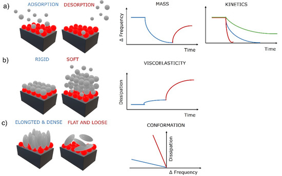 Surface phenomena at solid–liquid interface and the corresponding QCM-D response for (a) adsorption and desorption processes, (b) evaluation of viscoelasticity, and (c) molecular conformationRed balls represent a thin biopolymer film and gray balls, and spheres represent biomolecules (e.g., proteins, cells).