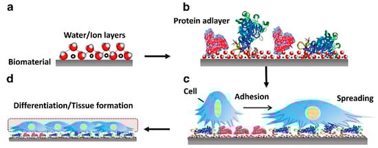Diagram of successive events on biomaterial surfaces and material–tissue interaction []. (a) formation of a hydrated layer, (b) formation of a protein adlayer, (c) cell adhesion and spreading, and (d) tissue formation. Reprinted with permission from from [], SpringerNature.
