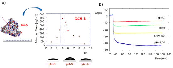 Detailed QCM applications for the adlayer monitoring have already been described and reviewed in other journals [,]. Protein adsorption is a key factor in cell activity, attachment, surface migration, proliferation, and differentiation towards the desired phenotype. It was reported that the monocomponent protein adsorption and conformational changes could be investigated with the QCM-D technique []. For example, the conformation of bovine serum albumin when adsorbed on a silica surface was determined by applying the QCM-adsorbed mass at various pH conditions [], as shown in Figure 4. Results revealed the highest protein coverage at a pH of around 5, close to the isoelectric point of the protein. The frequency change and the calculated adsorbed mass changed in the following order: pH 3 < pH 4 < pH 4.5 < pH 5 > pH 5.5 > pH 5.7 > pH 6 > pH 9 (Figure 4a). This pointed to a thicker protein layer at pH 5 compared to the layers at pH 3 and pH 9. It was assumed and later confirmed by AFM measurements that the protein binds to the silica surface in a “side-on” fashion at pH5, where the pyramid-shaped protein (proposed by the authors) binds to the surface with the bottom side of the pyramid with the tip exposed outwards, while it binds in a “flat-on” fashion at the other two pH values, resulting in a thinner protein layer.