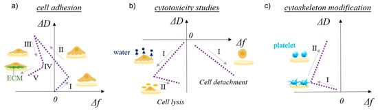 Schematic representation of QCM-D study of multilayer surface characteristics and cell–surface interactions. ΔD vs. Δf plots for cell adhesion provide information about (a) cell adhesion (I—initial adhesion, II—formation of attachment points, III—cell spreading, IV—steady state of spread cells, V—production of ECM), (b) cytotoxicity (left side: I—water release from cytoskeleton, II—cell lysis; right side: I—cell detachment), and (c) cytoskeleton modification, such as platelets activation (I—initial interactions among surface sensor and platelets, II—platelets spreading and pseudopodia formation). Reprinted with permission from [], Tonda-Turo, Carmagnola, and Ciardelli.