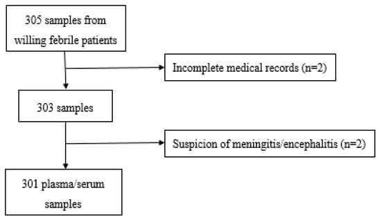 Patients of more than one year old with acute fever (temperature ≥38 °C) lasting for less than 7 days were eligible. Following a convenience sampling and after reading the study information note, outpatients meeting the eligibility criteria were included in the study by signing an informed consent form. However, patients with an incomplete medical record, as well as those with history of an acute injury or trauma and suspicion of meningitis/encephalitis, were excluded. The patient selection process is summarized in Figure 1.