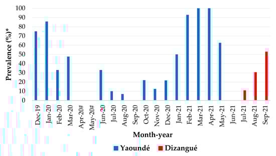 Prevalence of acute dengue infections in Yaoundé and Dizangué during the study period. * Cases confirmed by rtRT PCR. # No sample analysed due to COVID-19 lockdown.
