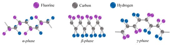 The chain conformation of the most observed phases in PVDF []. Because the fluorine atoms in the -phase are situated on the same side of the molecular chains, which are arranged parallel to one another in a specific direction, with the same dipole orientation and enhanced polarity, the -phase exhibits spontaneous polarization strength as well as pyro- and piezoelectric properties [].