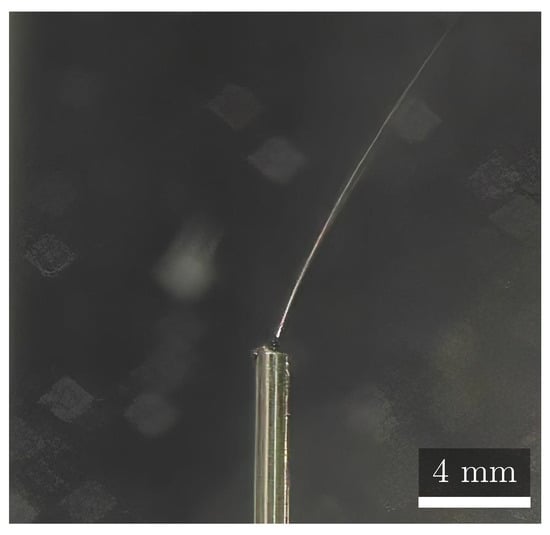 Drawing of a fiber from a forming Taylor cone at the tip of the emitter, in this case, a needle. The fiber is attracted towards the collector, which is no longer captured in this image. The material is 20% PVDF. The heated solution is still liquid in the emitter but during the whipping of the collector and fiber formation the solvent dries, and the PVDF solidifies [].