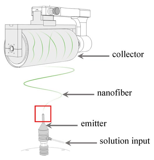 Illustration of the method of electrospinning in the form of a single needle acting as an emitter and a rotating cylinder acting as a collector, on which the nanofiber is gradually wound, and as a result it then creates a kind of fabric that can be used as the basis of a simple nanogenerator []. The red square highlights the emitter—the needle with the solution changing to a fiber, which was also described in Figure 2.