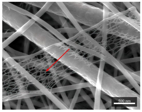 A structure of porous character resembling a cobweb. This structure was observed in combination with nylon-6 (PA6) []. The structures of smaller nanofibers within tens of nanometers are indicated by the arrow.