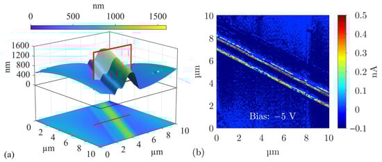 Using AFM, it is also possible to measure the piezoresponse of the sample, i.e., its ferro- and piezoelectric domain, specifically when using the PFM mode. In most cases, this is a very precise examination of only one fiber with a diameter of 100 nm to 3000 nm [,,,,], where the authors prove the properties of a particular sample (Figure 6) [,].