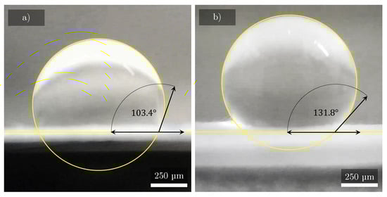 The hydrophobicity and hydrophilicity of PVDF are another of the relatively frequently investigated properties []. These properties may be important, for example, for active filters, membranes [,], or textiles [,]. It has been shown that with a higher collector cylinder speed during electrospinning, these properties can be controlled (Figure 7) []. Various collector speeds give the sample structure a different morphology, and as the collector speed increases, the fibers become more aligned. It is generally known that PVDF is a hydrophobic material, and researchers are trying to modify it to higher values up to superhydrophobic properties, with a contact angle >150 [,].