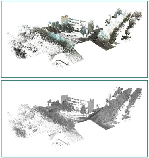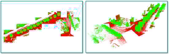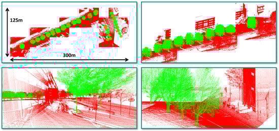 To evaluate the performance of our framework, we use the IQPC’15 benchmark dataset [], which has been acquired in the vicinity of the campus of TU Delft in the Netherlands with the Fugro DRIVE-MAP system. This system allows acquiring spatial 3D data in the form of a 3D point cloud as well as the corresponding reflectance and color information (see Figure 1). In total, the dataset corresponds to 26 tiles (each covering an area of 25 m × 25 m) and comprises 10,126,500 labeled 3D points, whereby the labeling distinguishes “tree points” from “other points” (see Figure 4). About  M 3D points (%) are labeled as “tree points”, and all remaining 3D points are labeled as “other points”. The provided reference labeling allows performance evaluation for a binary semantic classification of 3D points with respect to “tree points” and “other points”, whereas a separation of the “tree points” into clusters corresponding to individual trees has to be verified by visual inspection.