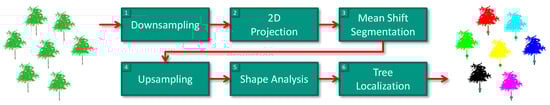 After the binary point-wise classification, we use the “tree points” and focus on a respective separation of these points into segments corresponding to individual trees. As a generic segmentation typically results in a high computational burden, we consider adaptations to retain an efficient approach for individual tree extraction, which is also scalable towards the processing of very large datasets, while still operating at point-level without requiring a voxelization of 3D space. More specifically, our approach mainly relies on insights gained in our previous investigations [,], and it is given by successively applying a downsampling of the “tree points” (Section 3.2.1), a 2D projection of the downsampled “tree points” (Section 3.2.2), a mean shift segmentation on the derived 2D projections (Section 3.2.3), an upsampling of the segmentation results to all “tree points” (Section 3.2.4), a refinement of the segmentation results via segment-based shape analysis (Section 3.2.5) and a localization of the individual trees in the considered scene (Section 3.2.6). As shown in Figure 3, we apply the second step of our framework only on the “tree points” and intend to derive plausible segments corresponding to individual trees.