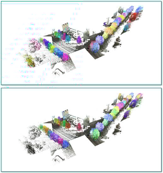 Among a diversity of objects, particularly trees play an important role in urban areas since they can provide measurable economic, environmental, social and health benefits [,]. As a prerequisite for urban planning, numerous municipalities and governmental agencies meanwhile focus on acquiring tree cadasters, which allow statements about the number of trees, the tree species and the physical and environmental effects of respective trees. Such tree cadasters can be derived from publicly available aerial and street view images from Google maps [], but in many cases, they are derived from acquired MMS point cloud data. To foster research on the extraction of individual trees from MMS point cloud data as, e.g., shown in Figure 1, a special track within the recent IQmulus Processing Contest IQPC’15 has been initiated []. This special track focuses on two subtasks facing the challenges of an irregular point sampling, a high complexity of real-world scenes and a huge amount of data resulting from the acquisition of larger scenes. The first subtask is given by the binary classification of the 3D points of an MMS point cloud into “tree points” and “other points”, whereas the second subtask is given by the separation of the “tree points” into clusters corresponding to individual trees. The joint consideration of both subtasks represents an instance-level segmentation inferring both class labels and instance labels [,]. To evaluate the performance of respective approaches for both subtasks, a labeled benchmark dataset acquired with a mobile mapping system in the city of Delft in the Netherlands has been released. This dataset comprises about  M labeled 3D points, whereby the reference labels are given at point-level with respect to a binary classification distinguishing “tree points” and “other points”. The results of a segmentation of individual trees can easily be verified by visual inspection. Regarding the IQPC’15, a diversity of proposed approaches for both subtasks relies on a voxelization of 3D space. For reasons of accuracy, however, it would be desirable to have an efficient end-to-end processing pipeline for individual tree extraction from MMS point cloud data that is scalable towards the processing of large datasets without involving a voxelization of 3D space.