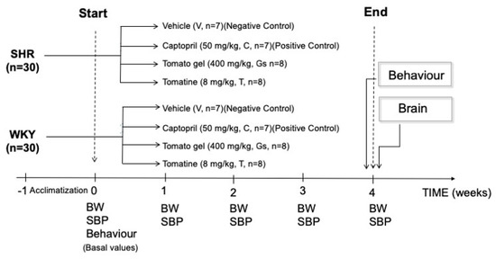 After a one-week housing period (acclimatization period) both Wistar Kyoto (WKY) and spontaneously hypertensive rats (SHRs) were randomly assigned and treated for four weeks, during which body weight (BW) and systolic blood pressure (SBP) were measured on a weekly basis. Basal SBP and basal weight were obtained just before starting any treatments, while behavioral parameters were assessed on the day before the treatments (basal behavior) and on the day before the end of the treatments (sacrifice day). After the animals were sacrificed, the brains were collected for ex vivo experimentation on brain slices.