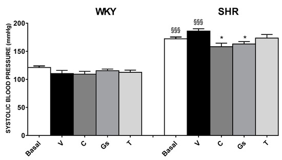 SHRs (right) and WKY (left) rats were treated for four weeks with vehicle (V), captopril (C) (50 mg/kg), tomatine (T) (8 mg/kg) or tomato gel/serum (Gs) (400 mg/kg). Basal: values recorded at the beginning of the four weeks of treatment. Data are reported as mean ± SEM. §§§ p < 0.001 vs. same treatment in WKY; * p < 0.05 vs. SHR V (ANOVA followed by Bonferroni).