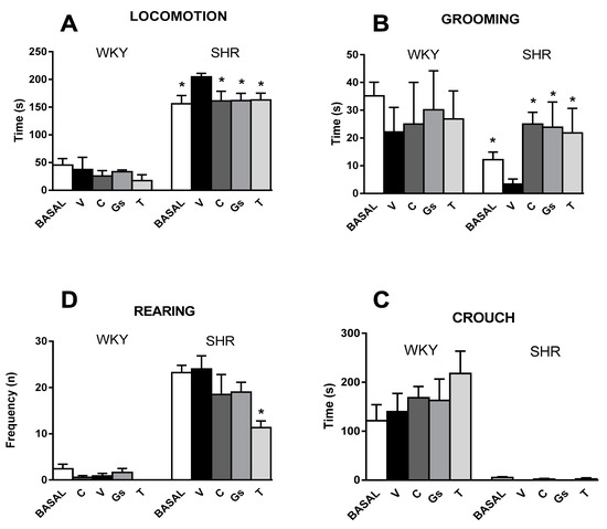 Time duration (s) of locomotion (A), grooming (B) and crouch (C) and frequency of rearing (D). SHRs (S) and WKY (W) rats were treated for four weeks with vehicle (V), captopril (C) (50 mg/kg), tomatine (T) (8 mg/kg) or tomato gel/serum (Gs) (400 mg/kg). Different behaviors were assessed at day 0 (before the treatment, BASAL) and at the end of any treatment. Values represent mean ± SEM; * p < 0.05 vs. SHR V; no significant differences were observed in the WKY groups (ANOVA followed by Bonferroni).