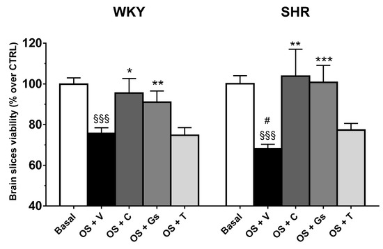 The brain is a major target of the deleterious effects of hypertension, and increasing evidence suggests that oxidative stress is involved in these harmful effects [11]. For this reason, we assessed whether brains of SHRs and WKY rats treated with tomato Gs, tomatine or captopril were (or not) less susceptible to oxidative stress-mediated injury. The results showed that hydrogen peroxide challenge significantly affected the viability of brain slices, with a more pronounced effect on those of SHRs (+8%, p < 0.05 vs. oxidative stress in WKY brain slices) (Figure 4).