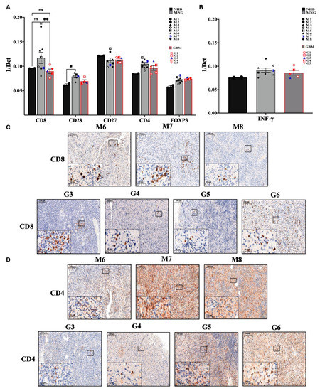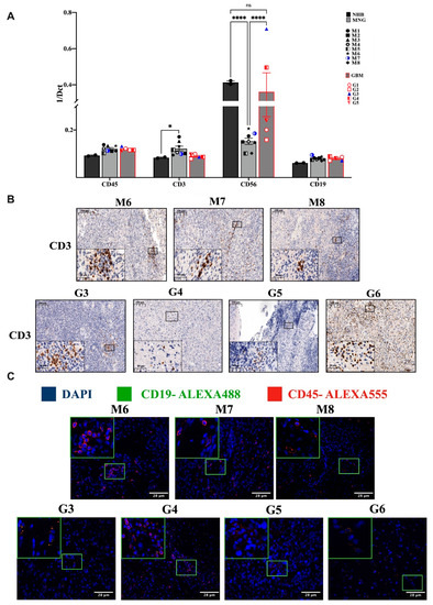 3.1. Variable Infiltration of T, B, NK Cells and Macrophages into MNG and GBM