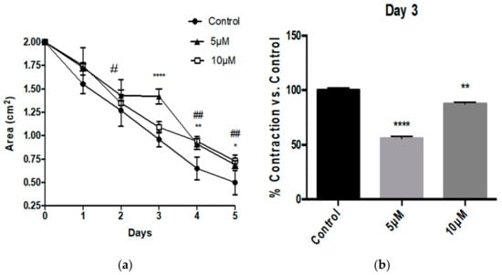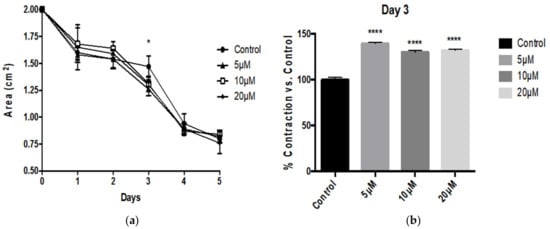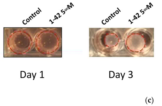 HBVSMC incorporated into collagen gels were prepared in 1 mL DMEM (supplemented with 10% FBS, PSA and glutamine) supplemented to a final concentration with Aβ (1, 5, 10, 50 μM) or cytokines: h-IL-1β (20 ng/mL), h-TNF-α (20 ng/mL), h-IFN-γ (400, 1000 U·mL−1), optimized in a dose–response assay previously []. Gels were then gently detached from the edges of the plates to allow unimpeded contraction and incubated for 4 days at 37 °C in 7.5% CO2. In these experiments, HBVSMC incorporated into gels attach to collagen fibers and promote progressive gel contraction over time. To monitor time and treatment-dependent changes in contraction, digital photographs of gels were recorded daily over 7 days (Nikon D40, Tokyo, Japan). Gel contractions in four replicate wells (quadruplicates) were averaged for each single n value, with n = 3 per group (i.e., 12 gels analyzed for n = 3).