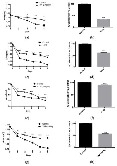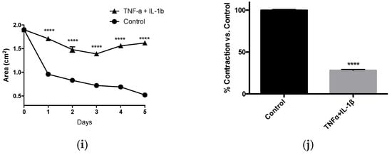 Inflammatory cytokines depress HBVSMC contractility. (a) 1000 U/mL of IFNγ treatment on HBVSMC resulted in greater area (measured in cm2) after 3 days. (b) HBVSMC treated with 1000 U/mL of IFNγ for 4 days showed a significantly lower contractility (expressed in % of contraction vs. control) compared with control treated HBVSMC. (c) 20 ng/mL of TNFα treatment on HBVSMC resulted in greater areas after 1 day up to 5 days. (d) HBVSMC treated with TNFα for 4 days showed a significantly lower contractility compared to control HBVSMC. (e) 20 ng/mL of IL-1b treatment on HBVSMC in collagen gel resulted in a larger area after 1 day up to 5 days. (f) HBVSMC treated with 20 ng/mL of IL-1b for 4 days showed a significantly lower contractility compared to control HBVSMC. (g) A combined treatment consisting of 1000 U/mL of IFNγ and 20 ng/mL of TNFα on HBVSMC in collagen gel resulted in even greater areas (measured in cm2) after 1 day. This effect persisted throughout the study (5 days). (h) HBVSMC treated with a combination of 1000 U/mL of IFNγ and 20 ng/mL of TNFα for 4 days showed a significantly lower contractility. (i) A combined treatment consisting of 20 ng/mL of IL-1b and 20 ng/mL of TNFα on HBVSMC in collagen gel resulted in a larger area (measured in cm2) after 1 day. This effect persisted throughout the study (5 days). (j) HBVSMC treated with a combination of 20 ng/mL of IL-1b and 20 ng/mL of TNFα for 4 days showed a significantly lower contractility. n = 3, ** p < 0.01, *** p < 0.001, **** p < 0.0001 versus control; Student’s t-test; data are mean ± SEM.