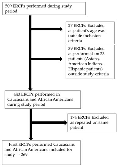 This was a retrospective, single-center Institutional Review Board (IRB)-approved study conducted at the Louisiana State University Health Sciences Center in Shreveport (LSUHSC-S) on 509 consecutive ERCP procedures performed on 327 patients between 2011 and March 2017. Among these procedures, 27 were excluded from the study because of the age range being outside the study protocol (age of 18 to 75 years included in our study). After excluding all other racial groups, 269 of the first performed ERCPs performed in Caucasians and African-American patients were included in the final analysis. (Figure 1).