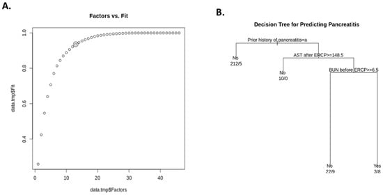 Elbow method extraction. The best factor (14) was extracted using the elbow method based on change in fit (A). (B) shows the clinical “decision tree” for predicting post-ERCP pancreatitis, which was created using Classification and Regression Trees (CART); major discriminative factors included prior history of ERCP, followed by AST after ERCP and BUN before ERCP.