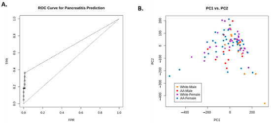 We applied decision tree learning to these data using “rpart” version 4.1-15 package by Therneau and Atkinson (Therneau, Terry and Atkinson, Beth. “rpart: Recursive Partitioning and Regression Trees. Online: https://CRAN.R-project.org/package=rpart, accessed on 12 April 2019) for the R statistical programming language which is derived from the Classification and Regression Trees (CART) algorithm developed by Breimann et al. [9]. This classifier was trained to detect post-ERCP pancreatitis using 10-fold cross-validation (Figure 3A). Contributions of each dimension to the best PCA were identified as follows: (1) AST before ERCP, (2) platelets, and (3) patient weight, which were the factors found to contribute the most to the outcome. Data covering the entire range of false positives are missing, so the remaining range is linearly interpolated (shown as a dashed line). The true-positive rate (TPR) was found to increase dramatically with small increases with the false-positive rate (FPR), indicating good performance of the approach (the dotted line depicts the performance of the classifier given random chance). Figure 2B shows the PCA with the best fit—most patients collected into a single cluster that failed to resolve into distinct subgroupings.