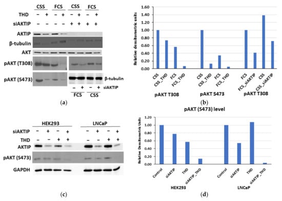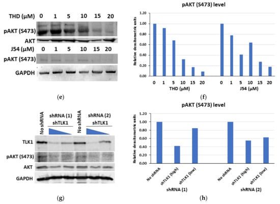 As expected, the TLK1 inhibition by a small-molecule inhibitor (Thioridazine- THD) results in the reduction of phosphorylation in both the T308 and S473 sites of AKT, with a more robust reduction in FCS-treated cells. Similarly, the knockdown of AKTIP also results in reduced T308 AKT phosphorylation, with a higher effect on FCS-treated cells (Figure 3a,b). Consistent with the report that AKTIP overexpression increased AKT phosphorylation at both of its regulatory sites [], we found that the siRNA-mediated knock-down of AKTIP decreased AKT phosphorylation at S473, and the effect is potentiated by the concomitant inhibition of TLK1 with THD, as evident from both HEK293 and LNCaP cells (Figure 3c,d). In addition, we tested a newly validated, small-molecule inhibitor of TLK1 (J54 []), in comparison to THD, and demonstrated that TLK1 inhibition results in reduced pAKT S473 levels, in a dose-dependent manner (Figure 3e,f). To further confirm that TLK1-mediated phosphorylation of AKTIP is essential for AKT phosphorylation, the shRNA-mediated knockdown of TLK1 was also conducted in HeLa cells, as described by Khalil et al., (2020) (Figure 3g) []. When the same blot was probed for pAKT S473, it showed that TLK1 depletion is associated with decreased AKT S473 phosphorylation (Figure 3g,h). We should stress that the amount of total AKT in all the WB in Figure 3 was not altered by either inhibitor TLK1 or siRNA to AKTIP.