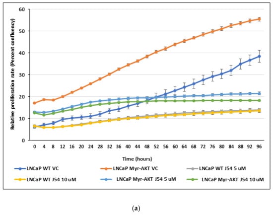 The cell proliferation assay was conducted, as previously described []. Briefly, 2000 cells/well were seeded in a 96-well plate, with 10% FCS containing media with or without different concentrations of J54. The plate was incubated in the IncuCyte zoom incubator at 37 °C with 5% CO2 for 96 h. Images were taken by the IncuCyte (Essen Bioscience, Ann Arbor, MI, USA) at every 4 h, and the cell occupancy percentage over time was determined.