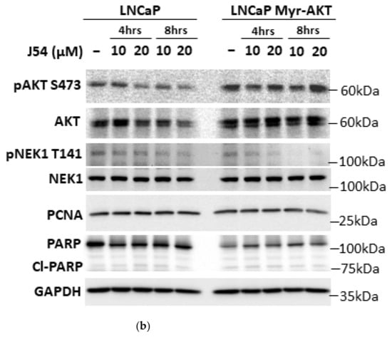 Since we demonstrated that TLK1-AKTIP signaling controls AKT phosphorylation on its regulatory sites (T308 and S473) and the disruption of this signaling either genetically or pharmacologically reduces AKT activating phosphorylation, we examined if the inhibition of TLK1 results in reduced proliferation of the cells. Indeed, LNCaP cells treated with varying concentrations of J54 results in a reduced proliferation rate compared to the vehicle control (DMSO)-treated cells (Figure 4). Unexpectedly, myristoylated AKT overexpressing LNCaP cells (LNCaP Myr-AKT), which are characterized by lipid raft-residing, constitutively active AKT, independent of PI3K pathway activation, can be equally inhibited in their proliferation rate upon TLK1 inhibition, by varying concentrations of J54 (Figure 4). This suggests that in addition to TLK1>AKTIP>AKT signaling, other pathways through TLK1 signaling, such as TLK1>NEK1>YAP, exist and regulate the survival and proliferation of PCa cells, as demonstrated by our previous work []. In support of this hypothesis, we monitored NEK1-T141 phosphorylation (the residue uniquely phosphorylated by TLK1) and could demonstrate its time- and dose-dependent inhibition by J54 in both the control and Myr-AKT expressing cells; it is clearly an independent substrate of TLK1 that does not involve active AKT (Figure 4b). We should recall that NIMA was identified in Aspergillus through the loss of function mutations that are unable to proceed through mitosis; that overexpression of a kinase-dead mutant of NIMA in mammalian cells results in G2 arrest, despite the presence of 11 NEKs, of which NEK1 is the first representative []. In previous work with LNCaP cells treated with J54, we reported an accumulation of cells in G2/M [], and this appears to be the main explanation for their growth arrest, rather than an effect on G1/S progression. In fact, a determination of the PCNA levels in both the LNCaP and Myr-AKT expressing cells did not reveal any differences at early time points following treatment with J54 (Figure 4b). This suggests that J54 does not affect the fraction of DNA replicating cells at early time points, as indicative of a deficiency in G1/S progression, a function that has been shown in some cell models to be dependent on AKT []. In addition, an analysis of the ratio of intact vs. cleaved PARP did not reveal an appreciable change in either the control LNCaP or Myr-AKT expressing cells, which would suggest an increase in apoptotic cells at early time points, following the addition of J54. However, it remains possible that at later times (subsequent cell divisions), there would be an increase in the fraction of apoptotic LNCaP cells, compared to Myr-AKT expressing, which we have not investigated. A key requirement for the interpretation of these experiments was the evidence that pAKT would remain unaffected by J54 in the Myr-AKT expressing cells, and in fact, pAKT-S473 was not changed, even at high concentration of J54, in contrast to the control LNCaP (Figure 4b).