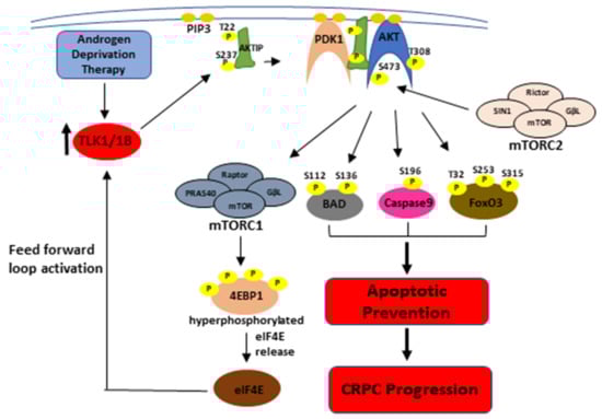 Graphical abstract depicting the regulation of AKT activation by TLK1-AKTIP signaling, and thereby, CRPC progression of PCa cells by apoptotic prevention. TLK1 phosphorylation of AKTIP increases AKT phosphorylation at its regulatory sites. AKT phosphorylates BAD, Caspase9, and FoxO3 and inhibits their pro-apoptotic function. AKT can also activate mTORC1 which will phosphorylate 4EBP1 and release eIF4E. Excess eIF4E will increase the translation of TLK1B isoform, and hence, initiate a positive feed-forward loop.