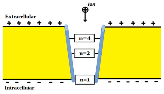 The voltage-gated channels form an activation gate or inactivation gate at the intracellular end of the membrane. Therefore, extracellular cations that come from outside will pass through the membrane potential (negative inside with respect to outside) to obtain kinetic energy equivalent to and an average thermal energy at body temperature of 310 K equivalent to [10]. On the other hand, intracellular cations will have an average thermal energy only [10]. As we mentioned previously, the model is applied on the closed activation and inactivation gates. The activation gate is located at the intracellular end as a hydrophobic constriction from the four S6 segments [18,19]. On the other hand, there are two types of inactivation gate: (1) fast inactivation gate and (2) slow inactivation gate, which have different proposals regarding their locations including the intracellular end and up to the selectivity filter [20,21,22]. Therefore, to account for different locations, we integrate the effect of gate location into the equation of quantum tunneling. As the location moves up from the intracellular end to the extracellular end, the membrane potential available for extracellular cations will be reduced and their kinetic energy will decrease. Accordingly, we choose three different locations: (1) n = 1: this location is at the intracellular end and the ion will pass through the entire membrane potential and the consequent kinetic energy will be , (2) n = 2: this location is higher than (1) and the ion will pass through the half of membrane potential and the consequent kinetic energy will be , and (3) n = 4: this location is higher than (2) and the ion will pass through the quarter of membrane potential and the consequent kinetic energy will be . See Figure 1. Therefore, we choose these arbitrary values of (n) in a doubling manner to show the influence of the level of the gate on the kinetic energy according to this equation and its influence on the quantum tunneling probability in the upcoming sections. However, any value of (n) can be chosen to show its effect on the kinetic energy of ion and on the tunneling probability.
