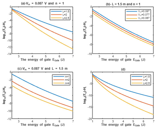 (a–c): represents the mathematical graph of common logarithm of tunneling probability for extracellular protons over gate’s energy range from 2.5 to 7 J according to gate length, membrane potential, and gate location, respectively; (d): represents the mathematical graph of common logarithm of tunneling probability for intracellular protons over gate’s energy range from 1 to 7 J according to gate length.