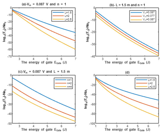 (a–c): represents the mathematical graph of common logarithm of tunneling probability for extracellular sodium ions over gate’s energy range from 2.5 to 7 J according to gate length, membrane potential, and gate location, respectively; (d): represents the mathematical graph of common logarithm of tunneling probability for intracellular sodium ions over gate’s energy range from 1 to 7 J according to gate length.