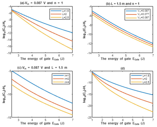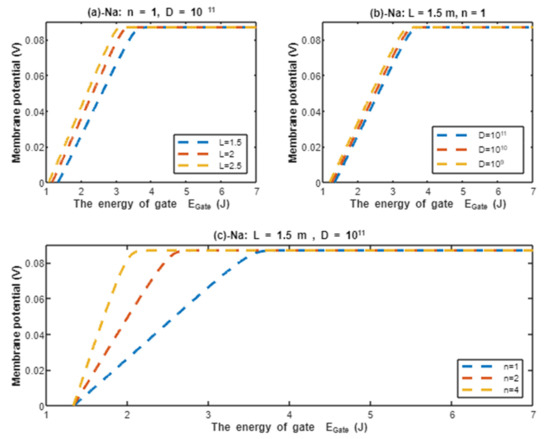 The graph (b) of Figure 8 evaluates the effect of the energy of the gate on the resting membrane potential under the influence of quantum tunneling of protons at three different values of gate length ( m, m, and m) and by setting , channels/cm2, and n = 1. See Table 30.
