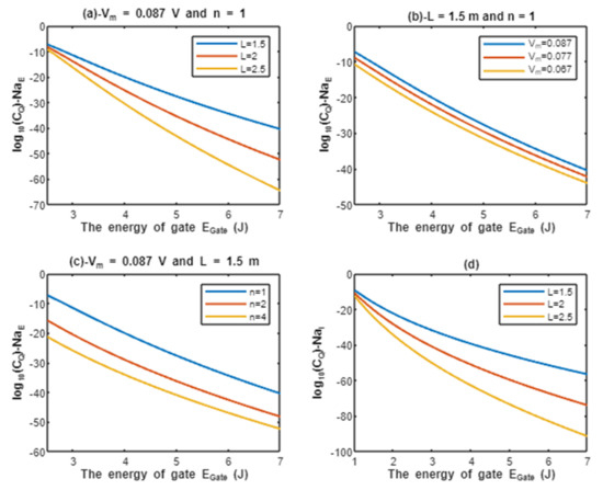Above each graph in the previous figure, we put setting values at which the evaluation of the relationship is based on. For example, in graph (a) of Figure 2 the plotting of the relationship between the common logarithm of tunneling probability of extracellular protons and the energy of gate is made by substituting the above setting values V and n = 1 in Equation (9) and by making the energy of the gate as the variable on the X-axis and the common logarithm of tunneling probability as the variable on the Y-axis. The relationship is plotted three times by substituting the setting values and each time, we substitute different value of gate length L (L = 1.5 m, L = 2 m, and L = 2.5 m) in Equation (9) to produce three plots. Each graph has its own setting values according to the factor that the graph, which is plotted three times, is based on. This style of evaluation will be applied to all graphs of this study. Additionally, this style of evaluation is used to facilitate the understanding of the influence of gate length, membrane potential, gate location, and the channels density on the tunneling probability and quantum conductance. Additionally, this style of evaluation of setting certain reasonable values of the variables helps to obtain consequent numerical values that can aid in the understanding of the behavior of the relationship and can be used for the purposes of comparison for different ions at the same setting values. Moreover, graph (d) of Figure 2 does not contain setting values because intracellular ions do not depend on membrane potential or the location of gate. Therefore, no setting values are required to assess the relationship.