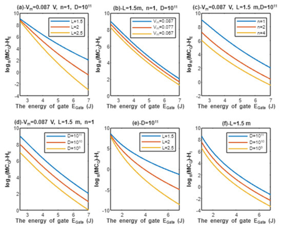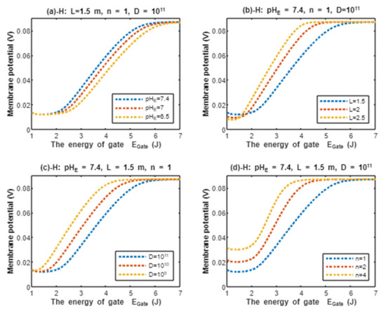 According to Equations (17) and (18), the relationship between the common logarithms of quantum membrane conductance of extracellular protons and intracellular protons , and the energy of gate is evaluated according to different factors. See Figure 6.