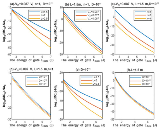 According to Equation (22), the resting membrane potential is assessed with regard to the energy of gate under the effect of quantum tunneling of sodium ions and according to different factors. See Figure 9.