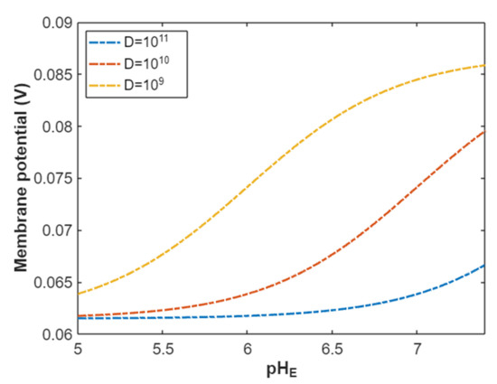According to Equation (25), the resting membrane potential can be assessed under the influence of classical transport of protons through open sodium channels. See Figure 10.