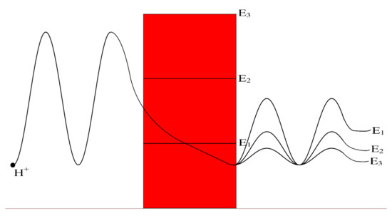 A schematic diagram that represents the quantum tunneling of the wave-function of a proton through different levels of gate energy E3 > E2 > E1. The lower is the gate energy; the higher is the tunneling probability, which is represented by higher amplitude of wave-function after tunneling through the gate (shown in red).