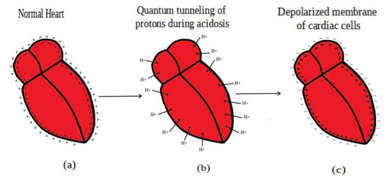 (a): represents normal heart with normal polarization (negative inside with regard to outside); (b): represents inward quantum tunneling of protons, which is indicated by inward arrows. This inward tunneling is responsible for membrane depolarization during acidosis according to the quantum model; (c): represents the state of membrane depolarization (positive inside with regard to outside), which is the outcome of protons tunneling that increases the tendency of arrhythmias and cardiac arrest.