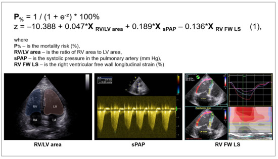 where RV EDA is the end-diastolic area of RV and RV ESA is the end-systolic area of RV. The tricuspid annular plane systolic excursion (TAPSE) was determined in M-mode. The tricuspid annulus velocity (S′) was assessed by PW Doppler. To analyze the longitudinal deformation of the RV free wall—RV FW LS 2D STE (speckle-tracking echocardiography)—we used an apical modified RV view at a frame rate of >60 frames/s. The region of interest was selected with the subsequent correction of RV wall thickness. RV FW LS was expressed as an absolute value [10].
