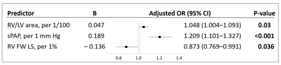 Characteristics of predictors included in the model (1). B—value of the coefficient in the equation; OR—odds ratio of mortality; 95% CI—95% confidence interval; RV/LV area—right ventricle to left ventricle area ratio; sPAP—systolic pulmonary artery pressure; RV FW LS (2D STE)—right ventricle free wall longitudinal strain (two-dimensional speckle-tracking echocardiography). Bold indicates significance (p-value of < 0.05).