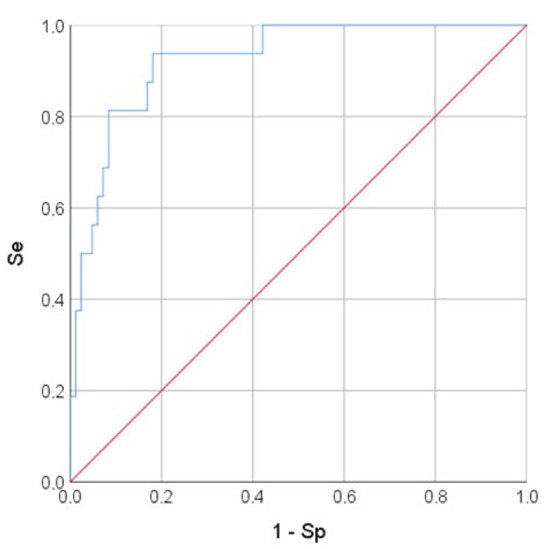 ROC-curve. The mortality risk on the values of the logistic function P%. The AUC-ROC was 0.925 ± 0.031 (95% CI: 0.863–0.986). The Se and Sp measures of model (1) at the cut-off point of 0.129 were 93.8% and 81.9%, respectively. The red line is the zero predictive value line (at Se + Sp = 100%), blue line–ROC-curve representing to the sensitivity function of the proportion of misclassified negative outcomes.