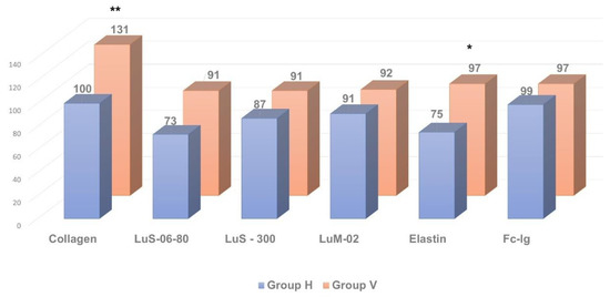 Comparative analysis of anti-pulmonary autoantibody concentration in individuals with clinically significant chronic fatigue of post-viral etiology (group V, n = 13) and healthy individuals (group H, n = 12). * p ≤ 0.05, ** p ≤ 0.01, group V > group H.
