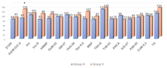 Comparative analysis of anti-visceral autoantibody concentration in individuals with clinically significant chronic fatigue of post-viral etiology (group V, n = 13) and healthy individuals (group H, n = 12). * p ≤ 0.05, group V > group H.